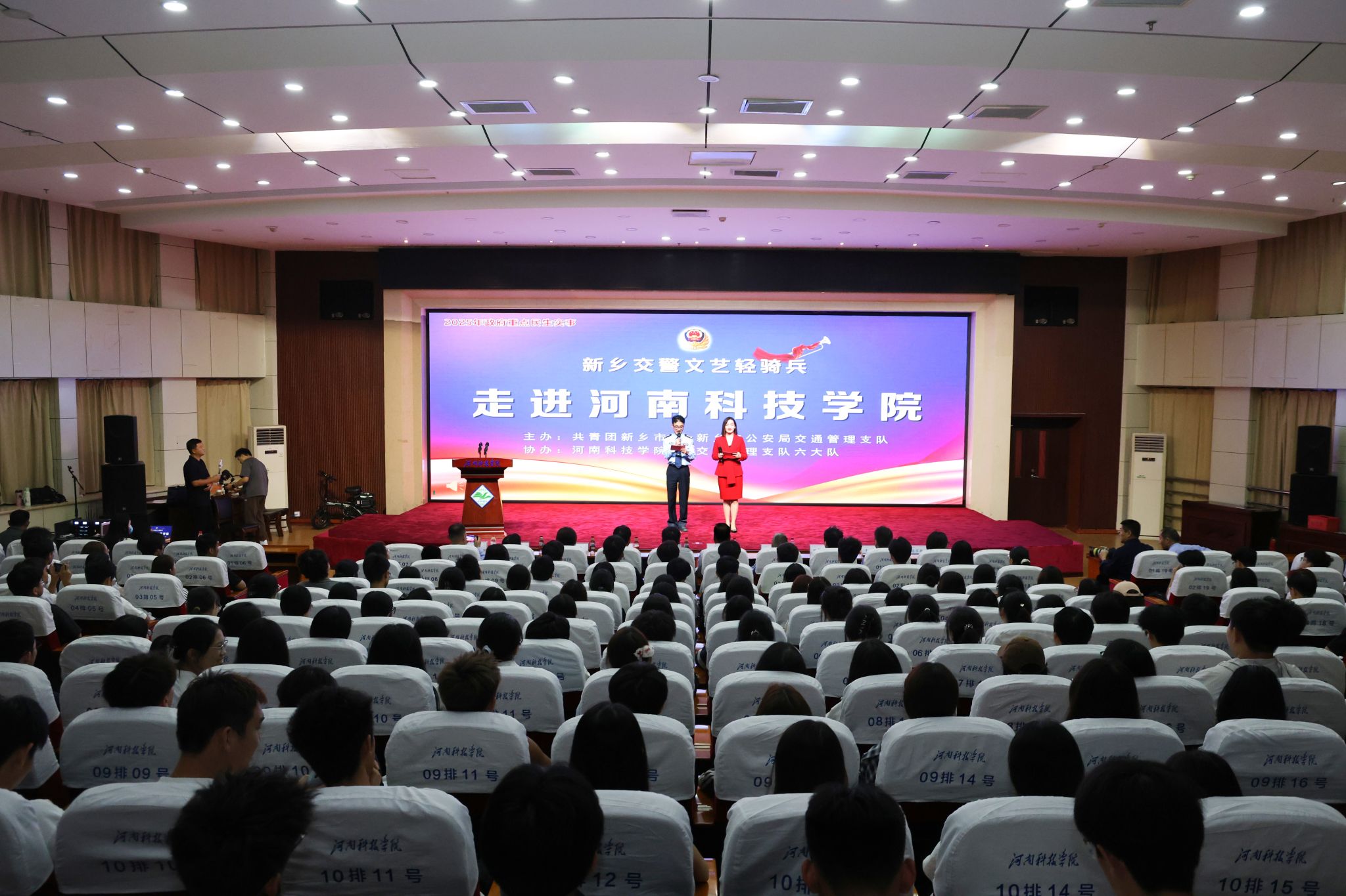 为提升大学生交通安全素养、推动警校共建平安校园,9月25日晚,在我校办公楼308会议室,新乡交警文艺轻骑兵“交通安全校园行”走进河南科技学院开展巡回宣讲演出。共青团新乡市委书记李杨、新乡市公安局党委委员张忠文、交通管理支队纪委书记臧丽娟、河南科技学院副校长乐玉忠出席活动。新乡市公安局交通管理支队有关领导和学校保卫处、团委、软件学院等部门负责人与现场400余名学生观看了演出。