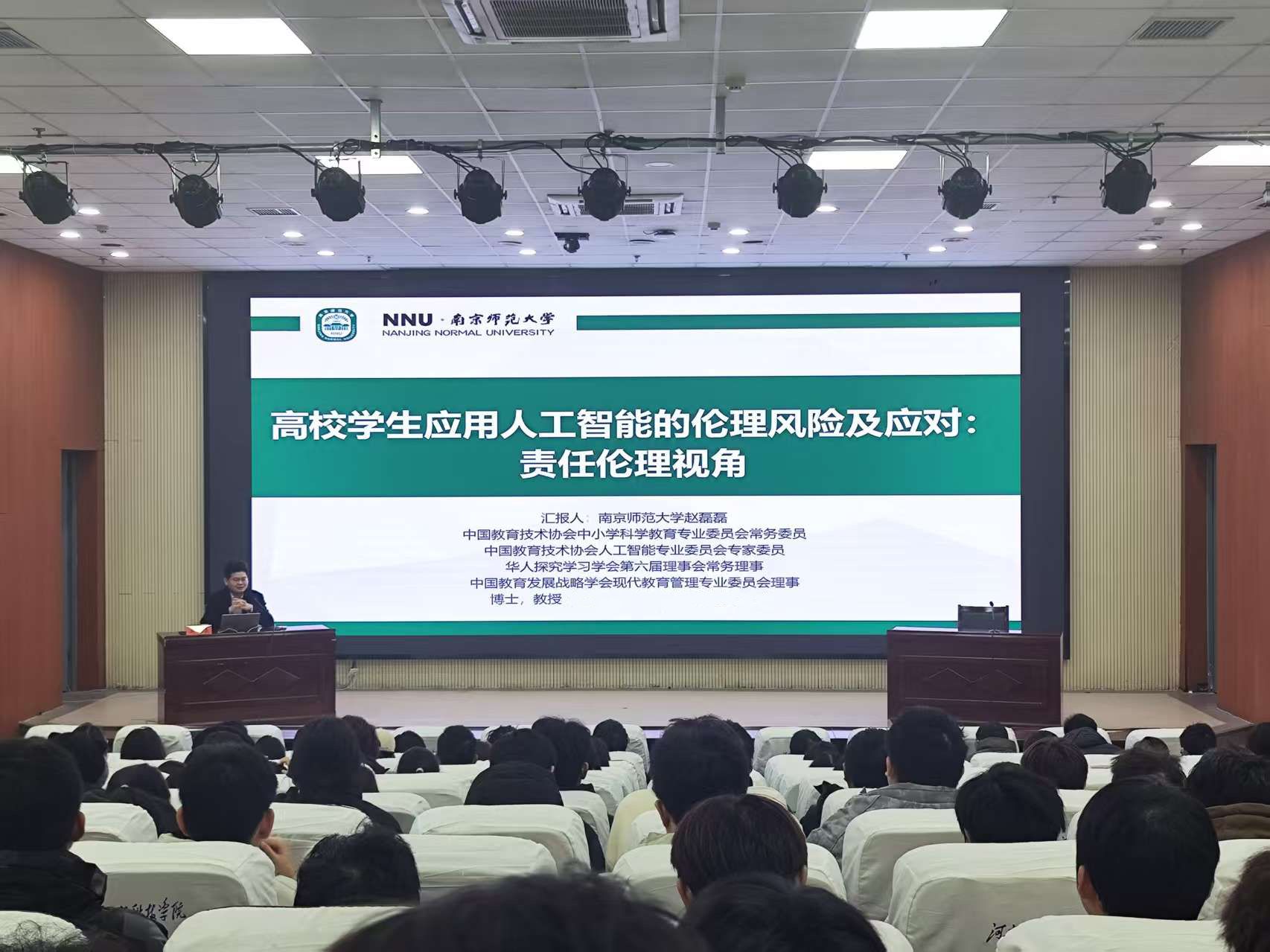 会上,赵磊磊教授以“高校学生应用人工智能的伦理风险及应对:责任伦理视角”为题,立足国家政策背景与学术前沿,系统阐释高校学生人工智能应用现状,从责任伦理维度深入剖析技术应用中的伦理困境,厘清潜在风险并提出治理路径,为师生构建起理解技术伦理的清晰认知框架。他寄语在场同学,要主动拥抱人工智能技术浪潮,筑牢专业根基、提升数字素养,同时要恪守学术诚信、厚植责任担当,始终保持独立思考能力、人文情感温度和社会使命担当。讲座既有效拓宽了大家的学术视野,又为青年学生树立正确的科技伦理观提供了重要指引。